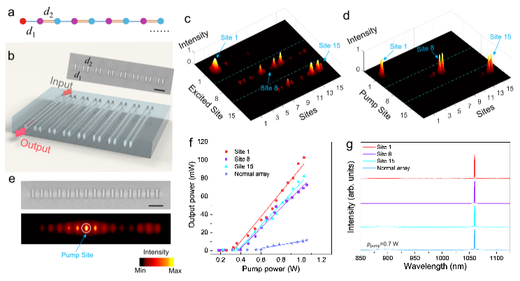 相较之下,研究团队采用的全固态激光架构展现出更优的性能,包括更高的受激辐射截面、更低的本征损耗,以及优异的热导率和光束质量。基于这些优势,不仅实现了拓扑边缘态的激光输出(输出功率突破100 mW),还在平凡晶格端点处观测到了拓扑边缘激光。更重要的是,凭借固态波导激光器的高增益特性,成功在晶格中任意拓扑界面位点激发激光,突破了传统几何边界对拓扑激光定位的限制。