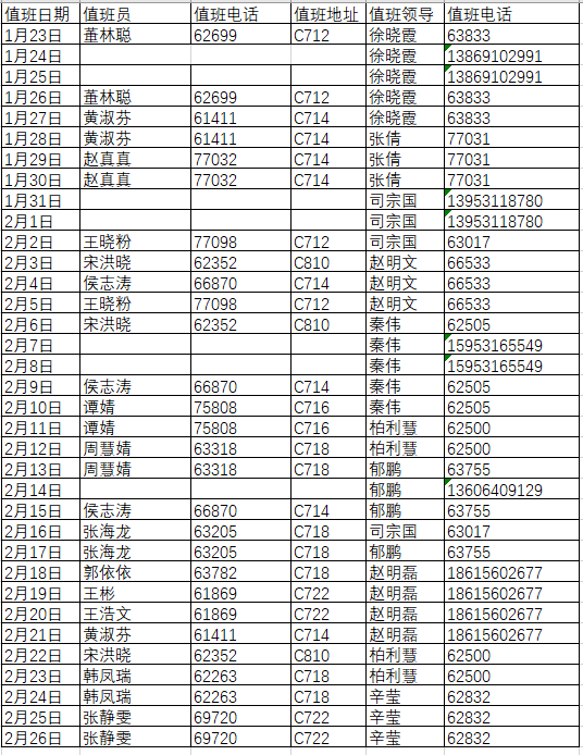 严格落实值班值守工作。学院安排处级干部和工作人员各1人白天在岗值班(不含周末),周末安排班子成员在校区驻地带班。假期严格落实“零报告”制度,如遇突发情况及时响应、妥善处置,第一时间报告。值班人员如下: