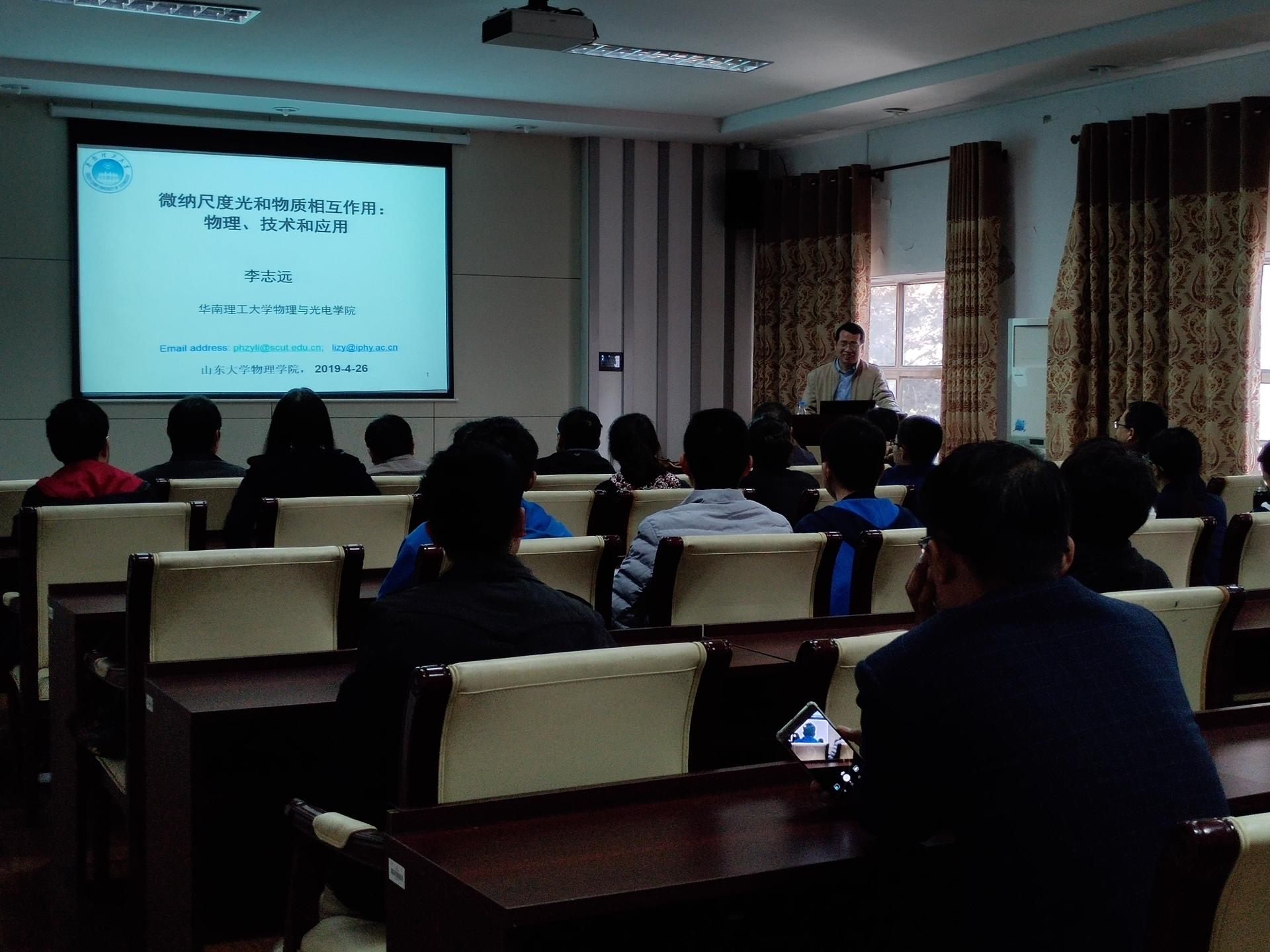 2019年4月26日下午,由山东大学研究生院、党委研究生工作部主办,物理学院承办的第42期(总第819期)“稷下风”研究生学术讲坛在中心校区物理学院离子束报告厅举行。李志远教授做客此次讲坛,讲述的主题为“微纳尺度光和物质相互作用:物理、技术和应用”。本次讲坛由物理学院院长陈峰教授主持。物理学院、晶体材料研究所、微电子学院部分师生参加了此次学术论坛。