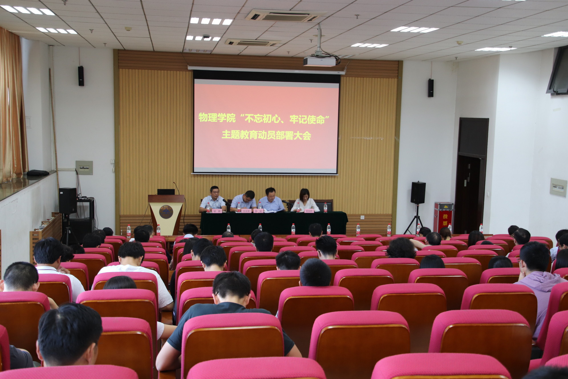 9月25日,物理学院在中心校区召开“不忘初心、牢记使命”主题教育动员部署大会, 深入贯彻习近平总书记关于“不忘初心、牢记使命”主题教育的重要讲话和重要指示批示精神,落实学校“不忘初心、牢记使命”主题教育会议和有关文件要求,对学院开展主题教育进行动员部署。学院党委书记郁鹏作动员讲话,院长陈峰出席会议,党委副书记徐晓霞主持会议。学校第二指导组组长杨斌出席会议并讲话。