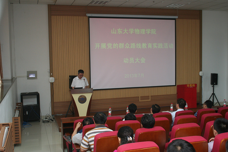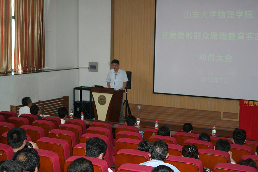 李建平传达了山东大学深入开展党的群众路线教育实践活动动员大会的主要精神,他表示,学院成立了党的群众路线教育实践活动的活动小组。相信在活动小组的带领下,学院一定认真学习党的群众路线教育实践活动精神,组织好实践活动,积极配合好学校各项工作,为学院营造良好和谐的人才培养和学术氛围。物理学院教育实践活动领导小组副组长、副院长黄性涛布置物理学院党的群众路线教育实践活动的实施方案,学院的实践活动结合自身实际情况,共分为三个阶段九项工作,黄性涛一一将各项工作进行落实,确保学院党的群众路线教育实践活动保质保量的顺利开展。
