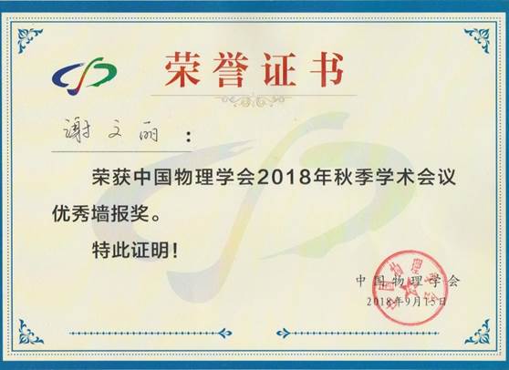 2018年9月13日至16日,中国物理学会2018年秋季学术会议(CPS Fall Meeting)在大连理工大学圆满结束。我院孙振东课题组的博士生谢文丽同学获得优秀墙报奖和奖金。会议学术委员会从879个墙报展示中评出了94篇“优秀墙报奖”。会上,课题组成员积极与参会师生交流学习,在向全国物理同行展示了团队的最新研究成果的同时,也表现了山东大学物理学院研究生的良好精神风貌。