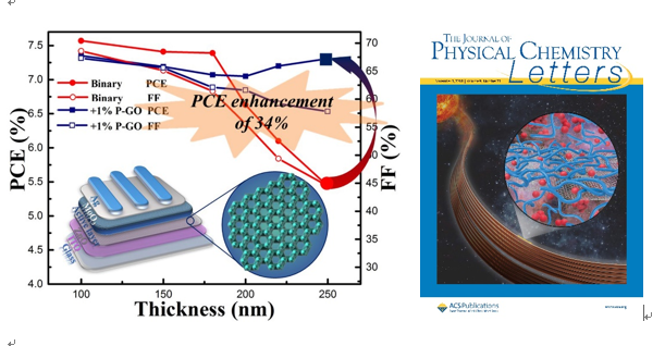 相关研究成果以“Functionalized Graphene Oxide Enables a High-Performance Bulk Heterojunction Organic Solar Cell with a Thick Active Layer”为题发表在《The Journal of Physical Chemistry Letters》(影响因子为8.709)(J. Phys. Chem. Lett. 2018, 9, 21, 6238-6248; DOI:10.1021/acs.jpclett.8b02701)上,并被选为该期刊的辅封面。《The Journal of Physical Chemistry Letters》是中科院SCI期刊分区中小类学科原子、分子和化学物理的一区期刊,长期入选自然指数(Nature Index)期刊榜单。论文第一作者是我院2016级硕士研究生吕承锟,山东大学为第一完成单位,通讯作者为郝晓涛教授。