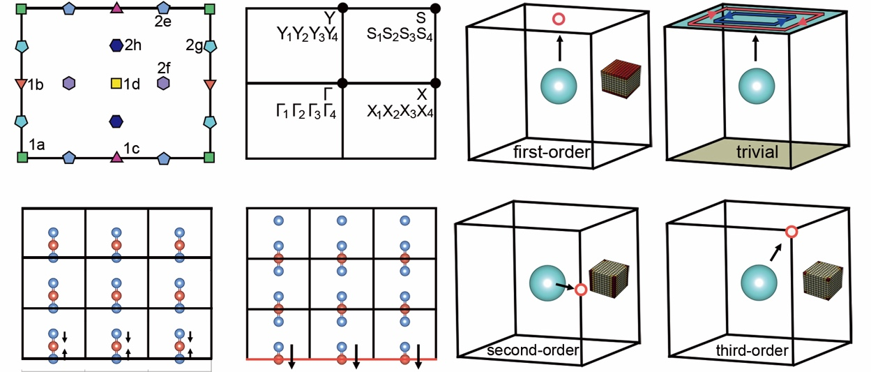 新奇拓扑物态的发现和不同拓扑物态的分类是凝聚态物理研究的主要课题。尽管目前的拓扑分类已经能找到大量拓扑非平庸相,但是拓扑平庸相的数量仍然远远多于拓扑非平庸相。如何寻找拓扑平庸相中隐藏的拓扑特性是拓扑物理和材料研究的重点之一。基于此,该团队提出了轨道转移引发的边界阻碍拓扑相,这种拓扑相与平庸的原子绝缘体是拓扑等价的,因而以前的拓扑分类将其视为拓扑平庸相,然而边界阻碍却可以让他同时存在着一阶表面态和高阶棱态或者角态。我们在拓扑量子化学材料数据库中对140号空间群的全部拓扑平庸材料进行理论计算,搜寻到了8种轨道转移引发的边界阻碍拓扑相,并在电子材料中首次实现了三阶拓扑绝缘体相。相关研究成果以“Orbital shift-induced boundary obstructed topological materials with a large energy gap”为题发表在Advanced Science上。论文第一作者为物理学院2020级博士生毛宁,牛成旺教授和戴瑛教授为共同通讯作者。