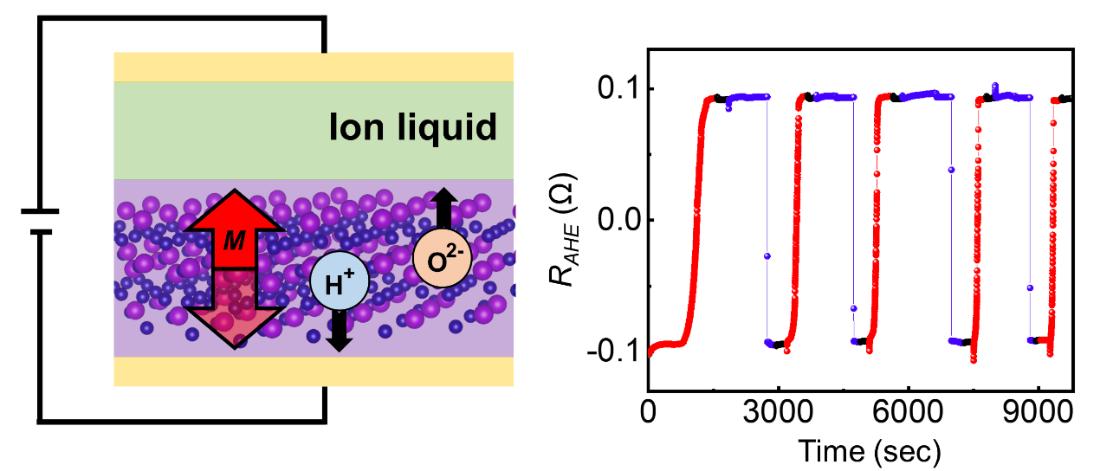 附图:氢、氧离子受门电压驱动在Pt/CoGd/Pt异质结中迁移,实现系统净磁化的非易失、可逆翻转。