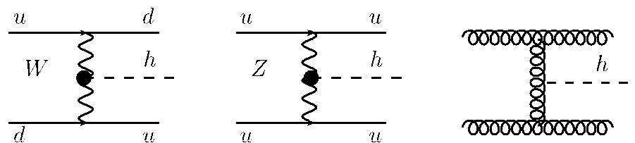 图 1 规范玻色子融合产生希格斯粒子费曼图,其中实线代表夸克,波浪线代表W/Z玻色子,卷曲线代表胶子。