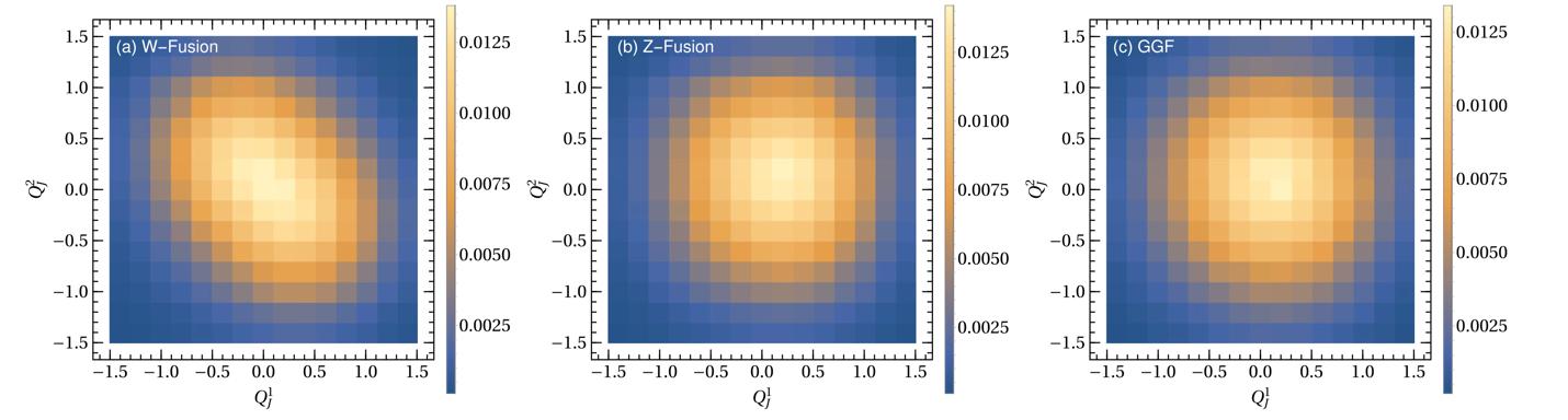 因为图1中的三个产生过程在对撞机上信号相似,尤其是前两个子过程的末态运动学几乎相同,在强子对撞机上如何区分上述三个产生过程是非常困难的,李海涛及其合作者提出运用喷注电荷来标记两个大快度区域的喷注,以探测产生希格粒子的虚粒子,即规范玻色子W、Z或者胶子,能量最大的两个喷注的电荷关联如图2所示。