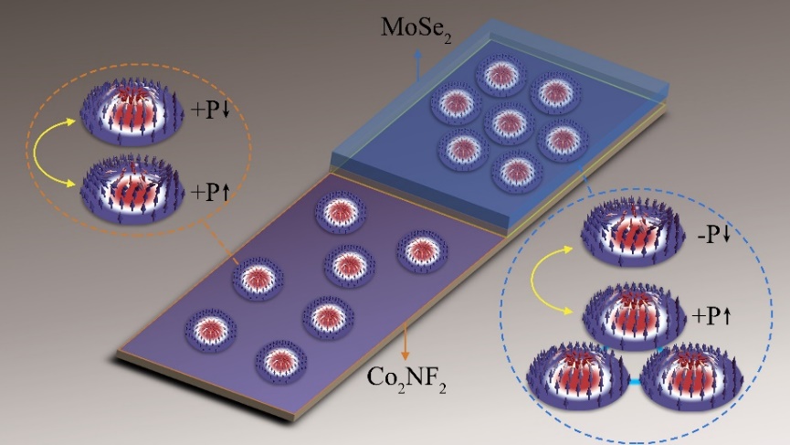 进展三:实现对磁斯格明子性质的有效控制是斯格明子研究中的一个重要挑战。为解决这一挑战,戴瑛教授团队基于第一性原理计算和蒙特卡洛模拟研究了二维多铁体系Co2NF2中的拓扑磁性性质。由于铁电极化的存在,单层Co2NF2表现出较大的Dzyaloshinskii-Moriya相互作用。其与磁交换相互作用会形成竞争,使得单层Co2NF2在磁场下可以产生尺寸小于10纳米的磁斯格明子。重要的是,由于磁电耦合效应,磁斯格明子的手性可通过铁电调控,这使得磁斯格明子具有四重简并性。当与单层MoSe2界面相互作用时,单层Co2NF2中磁斯格明子的产生和湮灭、以及磁斯格明子与磁斯格明子晶体之间的相变可以通过铁电反转实现。进一步地,该团队提出了一个无量纲参数k’作为在此类多铁单层中稳定磁斯格明子的判据。这一工作丰富了人们对于二维斯格明子和多铁性的研究。相关研究成果以 “Ferroelectrically Tunable Magnetic Skyrmions in Two-dimensional Multiferroics” 为题发表在Materials Horizons国际期刊上。论文第一作者为2022级博士生何仲麟,马衍东教授和戴瑛教授为共同通讯作者,山东大学为唯一作者单位。