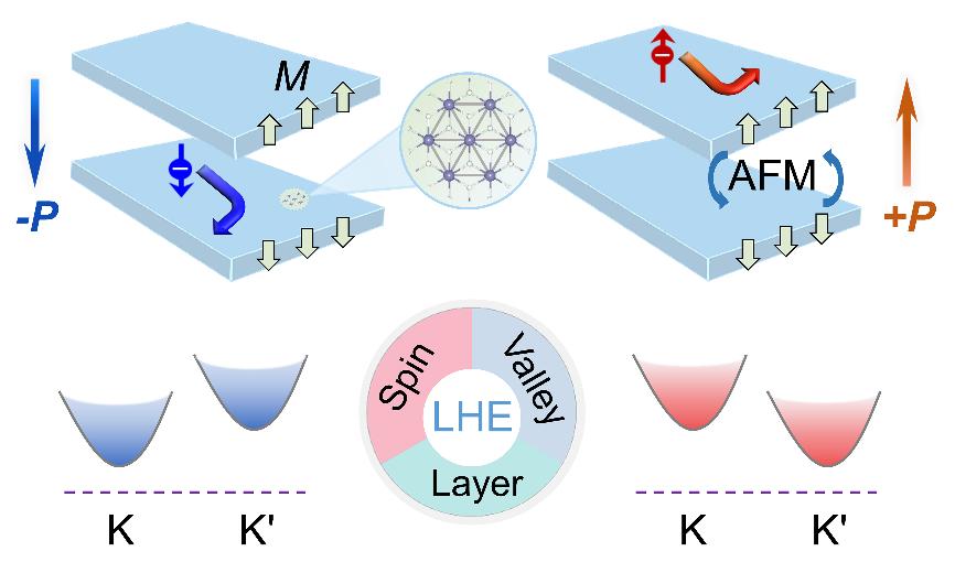 进展二:层霍尔效应是霍尔效应家族的一个新成员,具有重要的基础物理研究和实际应用价值。戴瑛教授团队利用对称性分析和k·p模型,基于层自由度与多铁性之间的耦合,提出了实现层霍尔效应的新物理机制。团队发现,通过时间反演对称性破缺与空间反演对称性破缺的共同作用,会在二维晶格中产生自发能谷极化性质。在堆垛成双层的情况下,体系会产生层极化的贝里曲率,其可以驱使电子在给定层的特定方向上偏转,从而产生层霍尔效应。更为重要的是由此产生的层霍尔效应是铁电可控的。进一步地,该团队利用第一性原理计算在双层多铁体系Co2CF2中验证了这一机制。该团队的这一发现为层霍尔效应和二维晶格的研究开辟了新的方向。相关研究成果以 “Layer Hall Effect in Multiferroic Two-Dimensional Materials” 为题发表在Nano Letters国际期刊上。论文第一作者为2021级硕士生冯阳阳,马衍东教授和戴瑛教授为共同通讯作者,山东大学为第一作者单位。