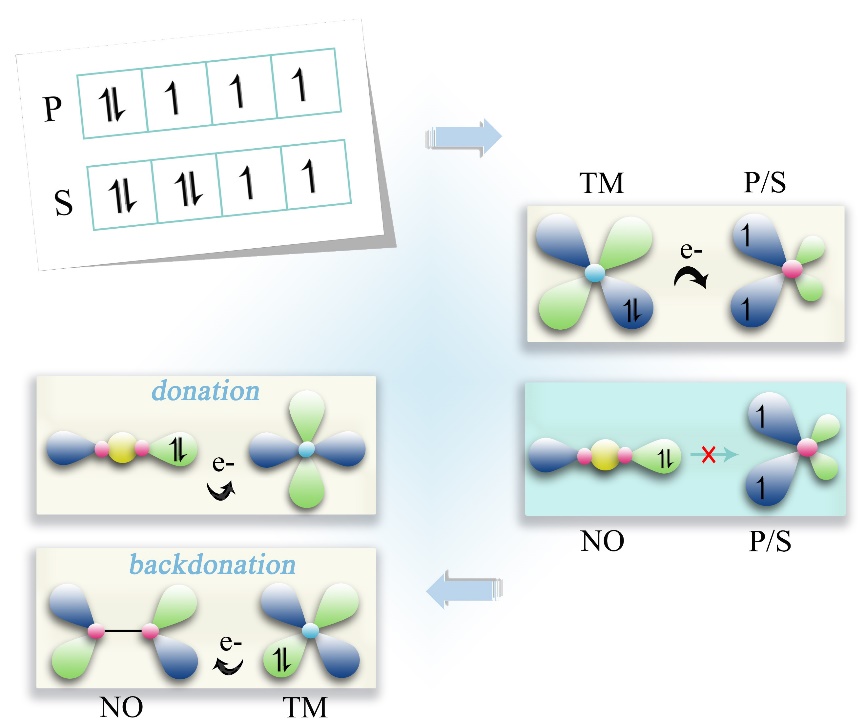进展四:作为催化的前沿领域,双原子催化在提高催化活性和选择性方面具有很大的潜力。团队提出在单原子催化活性中心中引入非金属P/S原子用于一氧化氮还原反应(NORR)的新机制,这一机制与非金属原子P/S的有限轨道密切相关。有限轨道的存在阻碍了P/S原子对于NO分子孤对电子的捕获;然而却促进了P/S周围TM电子性质的调控,从而提高TM活性中心与NO分子之间的 “donation-backdonation” 机制。基于这一新机制,团队设计了一系列P/S-TM负载在CN材料的双原子催化剂。通过系统的筛选策略,筛选出P-Cu@CN和S-Ni@CN具有高选择性和高活性的NORR性质。这项工作对于合理设计双原子催化剂提供了参考。相关研究成果以 “Activating Dual Atomic Electrocatalysts for the Nitric Oxide Reduction Reaction through the P/S Element” 为题发表在Materials Horizons国际期刊上,论文第一作者为物理学院2021级博士生臧艳梅,马衍东教授、戴瑛教授为共同通讯作者,山东大学为唯一作者单位。
