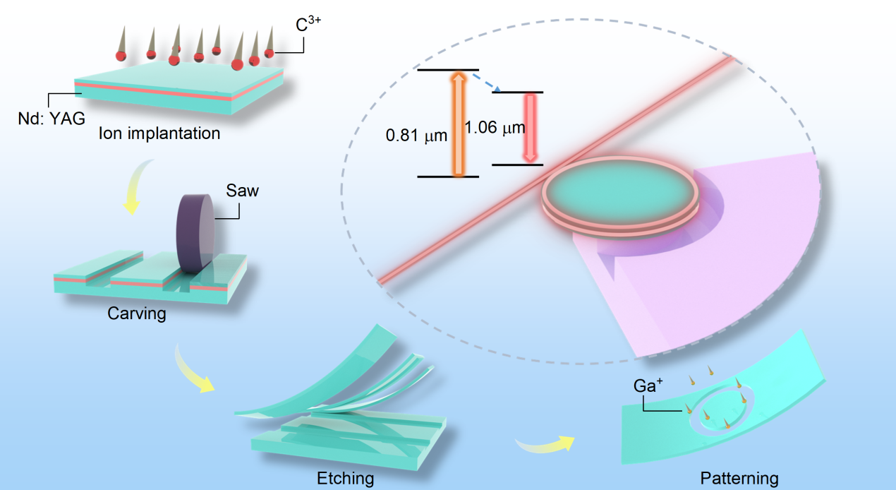 稀土元素掺杂的YAG晶体是最优秀的固态激光增益介质之一,具有高增益、高硬度、良好的化学稳定性和高热传导性等特点。通过掺杂各种稀土元素,可以在近红外至中红外波长范围(1微米至3微米)内发射激光,在传统的固体激光器中有广泛的应用。然而,YAG晶体的高稳定性和高硬度使得它难以通过化学和物理手段进行微纳加工,从而限制了其在微纳激光系统中的应用。为了解决这个问题,研究团队将碳离子注入到Nd: YAG晶体内,形成了一个缺陷层,利用这个缺陷层加速了化学腐蚀作用,成功地将厚度为1微米的Nd: YAG单晶薄膜从Nd: YAG块状晶体中剥离出来,最大剥离面积为10 × 0.1 mm2。基于这个晶体薄膜,他们制备了直径为30微米的耳语回廊模式固态微腔激光器,微腔的Q值为2.8 × 105。微腔激光的最大输出功率为1.1 mW,最大光光转化效率为12.4 %,这些参数是目前报道的微腔固态激光器的最大值。此外,研究人员还制造了独特的偏心微腔,实现了有效的自由空间泵浦光耦合,促进了微腔与波导的集成。这项研究为构建紧凑型光子源提供了一个新路径。