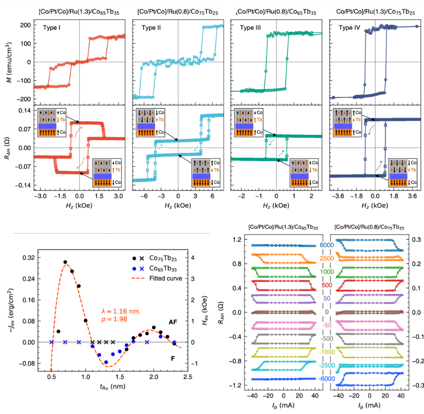 我院自旋电子学团队提出通过控制长程层间交换耦合和邻近的亚铁磁耦合,将铁磁、亚铁磁和反铁磁自旋构型的优点集成在 Pt/[Co/Pt/Co]/Ru/CoTb 人工合成反铁磁异质结中,取得了如下成果:(i)成功获得由Co/Pt/Co铁磁层和CoTb亚铁磁层组成的四种自旋构型,并证明层间交换耦合取决于Co3d-Ru5s-Co3d之间的RKKY相互作用;(ii)在具有宏观层间反铁磁耦合的Co/Pt/Co/Ru/Co65Tb35 异质结中,同时实现了室温下磁化的补偿和剩磁态反常霍尔电阻的增强;(iii)4种自旋构型均在10K到300K的温度区间内具有稳定的自旋轨道矩可控的磁化翻转。这种独特的人工合成反铁磁异质结构有望用于超高密度磁存储器、自旋逻辑器件以及神经形态计算硬件。
