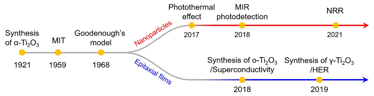 近日,李洋洋教授课题组从Ti2O3的合成、晶体结构、电子结构、物理性质和功能应用等方面进行了综述报道,这是该材料合成100年以来的第一篇综述文章。下图整理了自1921年Ti2O3合成以来,重要研究节点的发展时间线。Ti2O3凭借其超窄的带隙(0.1 eV)呈现出广阔的吸光范围(UV-Mid infrared)和高效的光热转换效率,在光热领域(光热水蒸发、光热脱氢和光热肿瘤治疗)、光探测领域和能量转换存储领域(电催化固氮、电催化产氢、锂离子电池)都具有巨大的应用潜力。