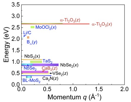 本文通过实验结合理论计算,在三维强关联氧化物α-Ti2O3单晶样品中发现超平(∆ωp <40 meV)的等离激元,并且该等离激元能传播到极大波矢(q > 1.2 Å-1)。分析表明,这种超平的等离激元特性起源于α-Ti2O3中强关联效应引起的平能带结构(费米能级附近)。由于电子波函数对称性引起的跃迁禁止使得其等离激元不被朗道衰减,从而使得其等离激元可以传播到极大波矢,优异于其他已报道的材料。该工作发表于Nature Communications 13, 4662 (2022)。2019级博士生高涵和2021级博士生丁超为论文第一作者,李洋洋教授和赵明文教授为通讯作者。