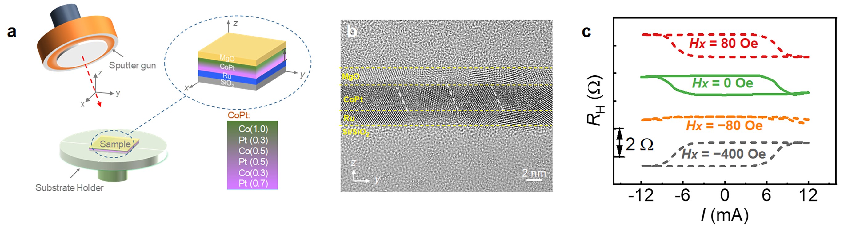 我院自旋电子学团队在倾斜溅射的具有成分梯度的垂直磁各向异性CoPt铁磁单层膜中,不需要外磁场辅助,也不需要额外的重金属层,实现了由电流产生自旋轨道矩诱导的磁化翻转;团队进一步将多维中心反演对称性破缺引入CoPt/Ru/CoPt强反铁磁耦合的人工多层膜中,实现了无外磁场辅助的电流控制的磁化翻转;相关研究成果分别发表在《ACS Nano》和《Physical Review B》上。