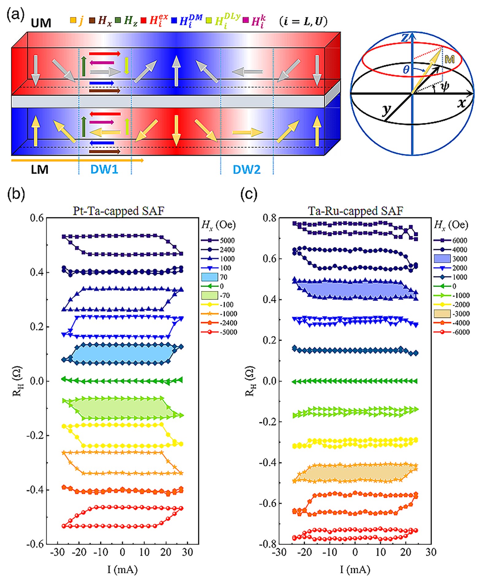 特别值得一提的是团队进一步将多维的对称性破缺引入到CoPt/Ru/CoPt人工强反铁磁耦合的多层膜中,通过对缓冲层和覆盖层的控制实现了对自旋轨道矩和层间Dzyaloshinsky-Moriya相互作用的调控,实现了无外磁场辅助下强反铁磁耦合体系中自旋轨道矩诱导的磁化翻转。考虑到反铁磁具有优异的热稳定性和零净磁化强度,该工作为制备人工反铁磁的自旋存储器件提供了新的设计思路。相关的实验和理论成果以“Critical magnetic field for lifting the degeneracy of monochiral domain walls with strong interlayer antiferromagnetic coupling”为题发表在《Physical Review B》上。物理学院2016级博士周铁为论文第一作者,文章的合作者还有博士生谢雪杰、赵晓楠、董亚男、王静、陈威斌、黄启坤、陈延学教授、柏利慧教授,以及北京航空航天大学的冷群文教授。田玉峰教授和颜世申教授为共同通讯作者。山东大学为第一作者单位和唯一通讯作者单位。