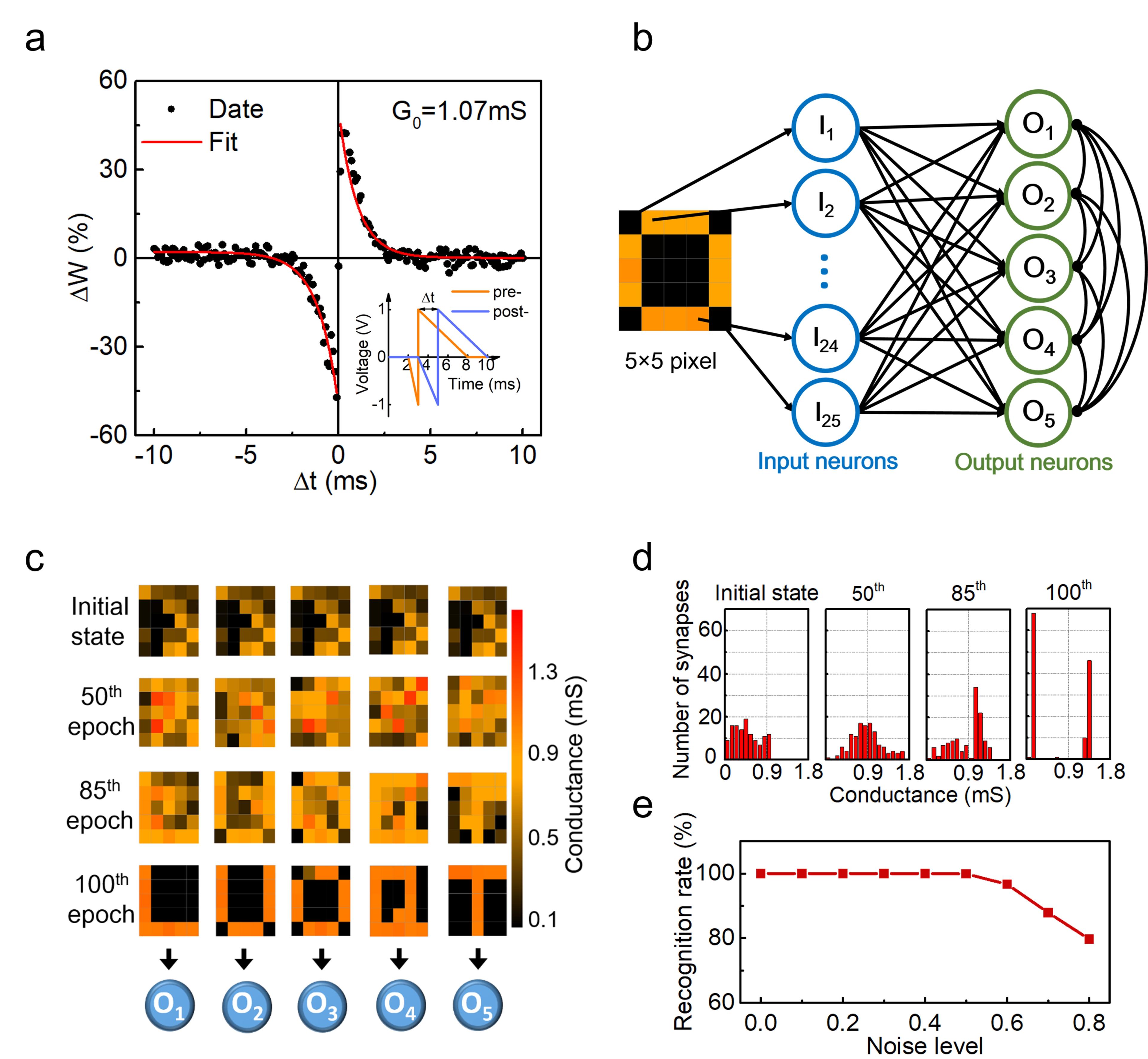 本文结合铁电极化翻转和氧空位迁移,设计制备出了一种非线性度低至0.13-0.17、权重更新非常对称的铁电隧道结人工突触。基于这类人工神经突触搭建的人工神经网络系统,其监督学习识别率高达96.7%。同时无监督学习中表现出平衡的STDP行为及优良的抗干扰性:噪声水平50%时其识别率仍接近100%。