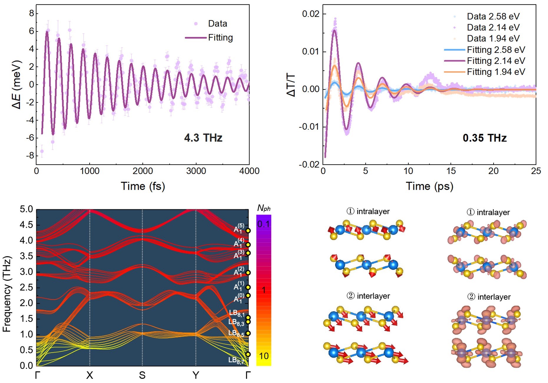 近日,我院陈峰教授团队与英国剑桥大学、中国科学院半导体物理研究所合作,通过飞秒激光诱导二硒化钯(PdSe2)层内及层间相干声子振荡,结合电子–声子、激子–声子的强耦合作用,分别实现了工作频率为4.3 THz和0.35 THz的光电性质调控。结构独特的PdSe2不仅具有反常层间相互作用,还具有极高的空气稳定性。结合超低波数拉曼和第一性原理计算,构建了电子–声子、激子–声子强耦合的直观的微观图像,揭示了层内相干声子优先与高能载流子相耦合,层间相干声子优先与低能激子相耦合的物理机制,为实现工作频率在THz即每秒万亿次级的光电器件提供了理论和实验支持。