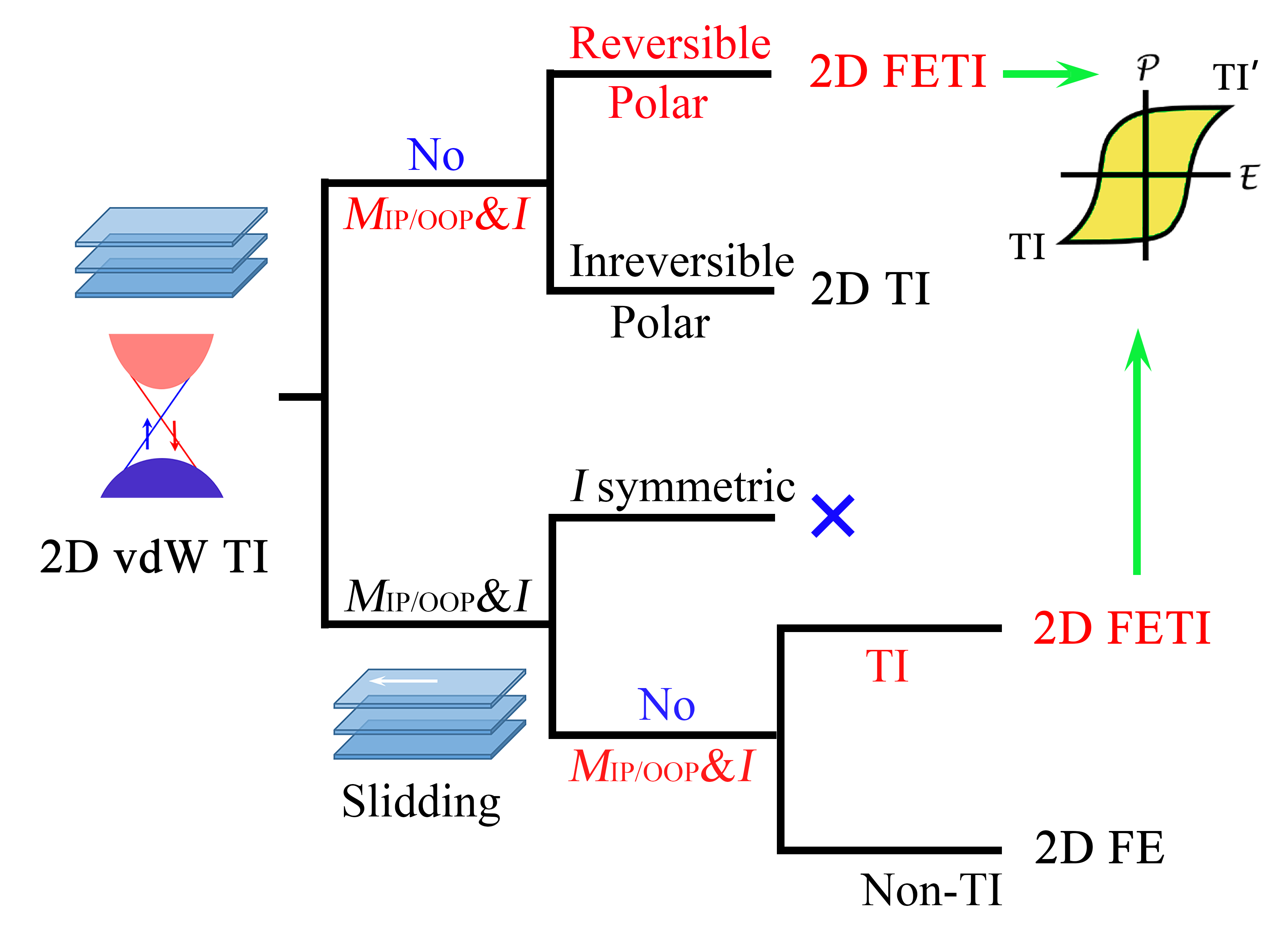 二维体系中量子自旋霍尔效应与铁电极化的耦合为非易失性调控拓扑态提供了新的可能,这同时也在低能耗、高响应速度的纳米电子器件应用上展现了巨大的前景。虽然铁电极化与能带拓扑的来源没有内在的排斥,但是它们在量子体系中的共存和耦合却少有报道。这主要是由于通常铁电性主要存在于宽带隙体系中,而拓扑体系大多为窄带隙。为突破以上研究限制,戴瑛教授团队提出层间滑移方法在拓扑材料多层中引入层间铁电性,并进一步阐明了实现多层铁电拓扑普适的筛选方法以及其中的耦合机制。