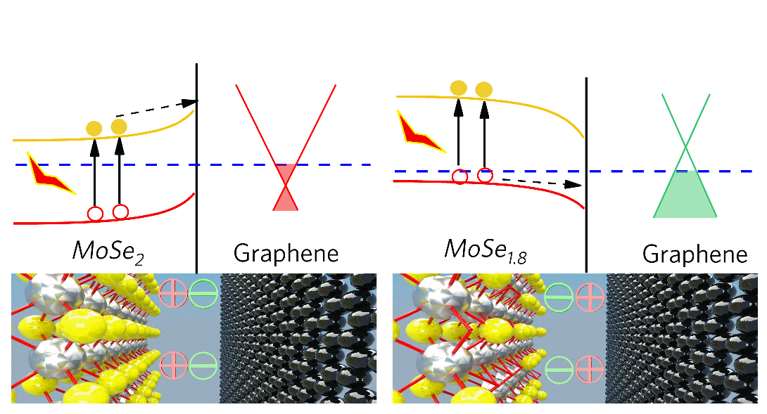 二维材料由于其独特的结构和优异的性能引起科学界、工业界广泛的关注。二维材料形成能比较低,在其制备、生产和存储过程中容易产生大量缺陷。这些缺陷会影响二维材料的光电、热学、机械等方面的性能,赢得程度上限制了二维材料的应用,因而实现对二维材料中缺陷的调控和进一步利用尤为必要。本工作中采用离子束辐照的方式在二硒化钼/石墨烯(MoSe2/graphene)异质结上层的MoSe2层中引入数量可控的硒(Se)缺陷。结果证明,Se缺陷的存在会调控MoSe2层的表面电势,造成graphene层和MoSe2层之间的表面势相对位置关系发生反转,改变了MoSe2/graphene异质结层间内建电场的方向,从而进一步改变异质结层间电荷传输的方向,最后导致MoSe2/graphene异质结光电光电流方向发生改变。离子辐照处理后的MoSe2/graphene光电探测器的响应电流方向由未处理时的负向转变为正向,其响应率R仍保持同一数量级,并且由于缺陷存在导致暗电流的大幅减小,处理后的样品拥有更高的比探测率D*。同时,第一性原理计算、扫描隧道电流测试、超快瞬态吸收光谱测试和透过谱测试结果均表明,离子辐照改变了异质结的能带结构,使其原本的禁带中产生了新的中间态,为光激发产生的电子跃迁提供了中间“跳板”,与原始样品相比在近红外波段范围拥有更高的光电探测性能。利用MoSe2/graphene光电探测器响应电流方向可调控这一性能,制备了可切换的“与”门、“或”门光逻辑门电路,完成了简单的光逻辑运算,为实现二维材料视神经网络模拟提供了一种有意义的研究思路。
