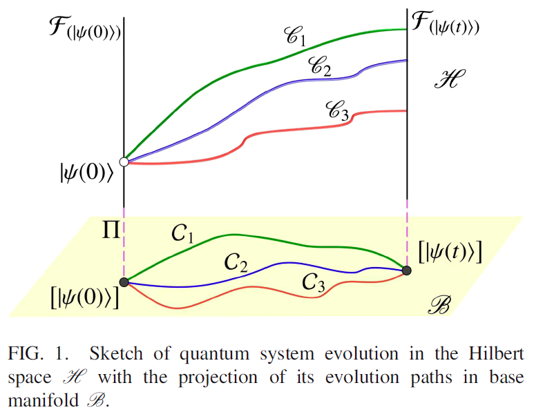 量子体系在希尔伯特空间H 中的演化及其在底流形B 中的投影示意图。