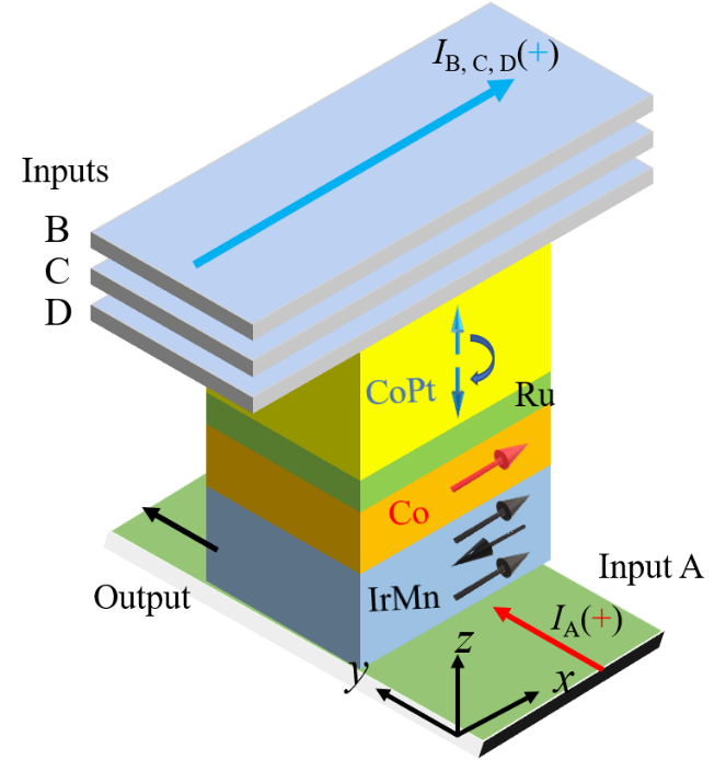 为了在单个磁性异质结中,利用电场调控自旋轨道矩引起的磁化翻转,实现完备的自旋逻辑功能,该团队制备了Pt/IrMn/Co/Ru/CoPt磁性异质结。研究发现:在y方向施加电流能有效控制IrMn/Co之间的交换偏置和面内Co层磁矩方向,进而控制CoPt层自旋轨道矩引起磁化翻转的方向;在x方向施加电流能利用自旋轨道矩效应控制CoPt层的磁化翻转。通过控制x和y两个方向施加电流的大小及方向,在单个Pt/IrMn/Co/Ru/CoPt磁性异质结中成功实现16种布尔逻辑运算。在单个非易失磁性异质结中实现纯电流可控的完备自旋逻辑功能,为可编程自旋逻辑器件的实用化夯实了基础。