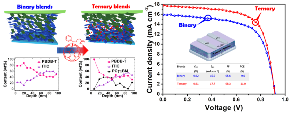 郝晓涛课题组发现利用常规的富勒烯衍生物材料(PC71BM)可以有效调控高性能非富勒烯体系(PBDB-T:ITIC)的垂直相分布,它可使给、受体垂直分布在体异质结中的理想区域,进而可以有效提升活性层的微纳形貌、载流子迁移率等性质,从而显著提升器件的能量转换效率。此项研究为制备高性能有机太阳能电池器件提供了新思路。