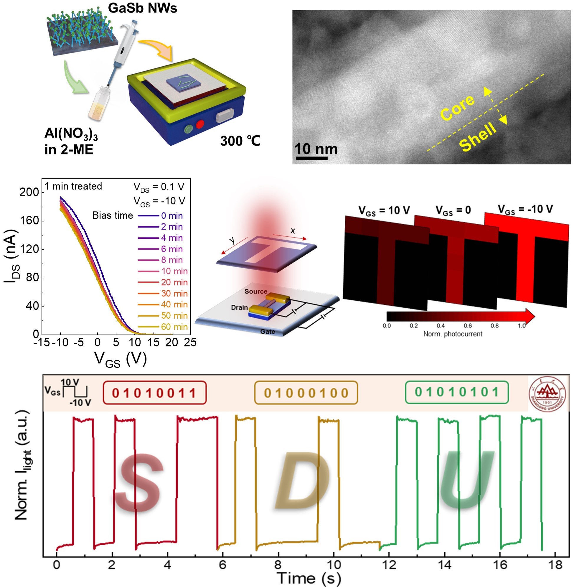 表面态在锑化物纳米线光电子器件中往往充当电荷陷阱,导致器件在偏压、栅压下工作不稳定,阻碍了锑化物纳米线在下一代光电子器件中的实际应用。表面钝化或者修饰可以有效调控表面态,从而优化光电子器件的性能。杨再兴等人首次通过低温溶液-退火法在锑化物纳米线表面生长了厚度可调的氧化铝钝化壳层。低温溶液-退火法易操作、成本低且与现有CMOS工艺兼容。得益于低温溶液-退火法生长的氧化铝壳层的独特双电层效应,锑化物纳米线表面态的电荷陷阱作用得到抑制。相较于纯GaSb纳米线场效应晶体管,生长了氧化铝钝化壳层的GaSb纳米线场效应晶体管的偏压稳定性得到大幅提升,展示出较小的开态电流衰减(<10%)和可忽略的阈值电压移动。当进一步应用到红外探测技术中,器件展现出稳定的、优异的栅极调控红外探测成像及通讯能力。相关研究结果以“Toward high bias-stress stability p-type GaSb nanowire field-effect-transistor for gate-controlled near-infrared photodetection and photocommunication”为题发表于Advanced Functional Materials期刊上。学院为论文第一通讯单位,博士生洒子旭为论文第一排名作者。