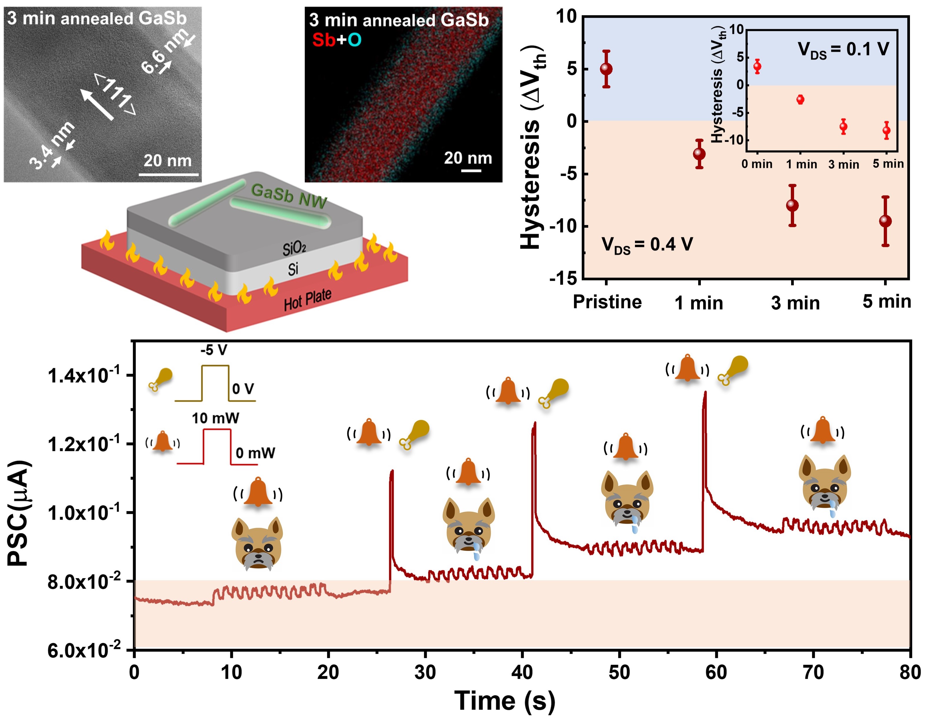 Si及其工艺为什么是主流?其中一个原因就是其表面能形成高质量的介电材料SiO2。一般情况下,锑化物纳米线的表面存在着2-5 nm厚度的天然氧化层。这些天然氧化层往往充当着表面电荷陷阱的作用,锑化物纳米线场效应晶体管的偏压稳定性差。本工作中,杨再兴等人在大气中原位退火锑化物纳米线,在纳米线表面氧化出厚度可控的氧化层。得益于退火生成的表面氧化层中可移动氧离子的电荷补偿作用,锑化物纳米线天然氧化层(表面态)的电荷陷阱作用得到抑制。相较于具有天然氧化层的GaSb纳米线场效应晶体管,退火处理的锑化物纳米线场效应晶体管的偏压稳定性得到大幅提升(回滞窗口ΔVth ~ 0.54 V)。退火生成的氧化层中可移动的氧离子也促使锑化物纳米线在未来类脑计算领域展示出优秀的应用潜力:器件结构简单(无需额外介电层、无需设计器件结构)是最大的优点。相关研究结果以“An Amorphous native oxide shell for high bias-stress stability nanowire synaptic transistor”为题发表于Advanced Science期刊上。学院为论文第一通讯单位,校特别资助类博士后庄昕明博士为论文第一排名作者。
