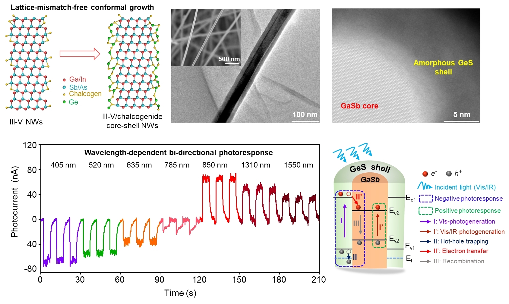 构建核壳结构是钝化锑化物纳米线表面态的有效手段之一。然而,晶格匹配极大的阻碍了高质量核壳异质纳米线的构筑。在前期的工作中,利用硫族元素的表面活性剂作用,杨再兴等人成功抑制了锑元素的“趋肤效应”,得到了锑元素分布均匀、直径可控的锑化物纳米线(Nature Communications 2014, 5, 5249)。基于此,利用充当表面活性剂作用的硫族元素作为“纽带”,杨再兴等人在锑化物纳米线表面成功生长出非晶的硫族半导体壳层。采用非晶硫族化合物半导体作为钝化壳层,解决了构筑核壳纳米线中的晶格适配难题。通过优化生长条件,实现了对核壳结构纳米线的组份、直径(壳层厚度)以及表面形貌的调控。成功构筑核壳结构后,锑化物纳米线的表面态得到成功调控,其稳定性显著提升并展示出有趣的光电探测行为。比如,构筑的GaSb/GeS核壳异质纳米线由于具有I类异质结构和非晶的壳层,呈现出独特的波长依赖性双向光电探测能力和可见光辅助增强红外探测性能。该无晶格适配构筑核壳异质纳米线方法的普适性在多种III-V族和II-VI族半导体纳米线中得到验证,比如GaAs/GeS、InGaAs/GeS和CdS/GeS核壳异质结纳米线。相关研究结果以“Lattice-mismatch-free construction of III-V/chalcogenide core-shell heterostructure nanowires”为题于11月18日在线发表在Nature Communications期刊上。学院为论文第一通讯单位,校特别资助类博士后刘风景博士为论文唯一第一作者。
