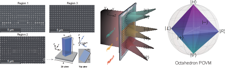 在该研究中,研究团队设计了可进行广义测量的光学超构表面(Metasurface)。超构表面由三个超构表面单元嵌套组成,每个单元由一系列的纳米硅柱组成阵列,通过设计每个硅柱的几何结构可以对入射光的相位和强度进行调控。该超构表面可以同时将光子的偏振状态展开到信息完备测量基矢上,并将六束光分解到不同的空间通道进行探测。这种广义测量在布洛赫球上对应了一个正八面体几何结构(如下图所示),也被称为八面体POVM。