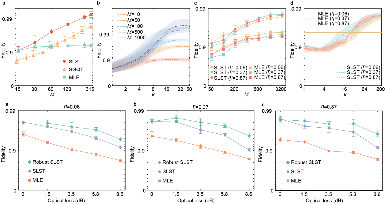 研究团队还提出了一种自学习阴影层析技术(SLST),这种技术结合阴影层析与同步扰动随机逼近算法(SPSA),用ST对弗罗贝尼乌斯范数进行无偏估计并作为损失函数,再用SPSA对描述量子态的参数做全局优化进行量子态重构。实验结果表明,在同样的采样数目下,SLST以较小的经典迭代次数达到更高的精度,可以有效降低重构量子态所需要的样本复杂度的后处理复杂度,并且具有抗噪声的优点(如下图所示)。