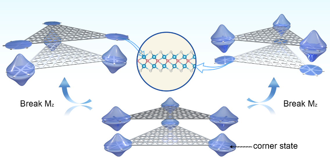 进展二:在二维材料中,层的出现划分了实空间,成为一个新自由度,探索拓扑态与层自由度的耦合,实现对其非易失性控制,成为了一个有潜力的研究方向。近期许多二维材料被发现具有铁电性或铁磁性,同时具备多种铁性序的多铁材料不仅存在可逆的电极化切换特性,而且能与铁磁性耦合,在器件应用中发挥关键作用。特别是具备垂直电极化的二维铁电材料,为研究拓扑态与层自由度之间的相互作用提供了一个有前景的研究平台。戴瑛教授团队从理论上预测在二维铁电材料H'-Co2XF2(X=C, N)中,存在二阶拓扑绝缘体相和层极化的角态。H'-Co2XF2中内在铁电性建立了拓扑边界态与层自由度之间的耦合,允许通过铁电极化反转来操纵不同层中二阶角态的空间分布,即实现了角态的层选择性。这一发现揭示了铁电与拓扑之间的强耦合现象,对自旋电子学和铁电器件的潜在应用具有重要意义。相关研究成果以“Layer-coupled corner states in two-dimensional topological multiferroics”为题发表在国际期刊Materials Horizons上。论文第一作者为2021级博士生李润晗,牛成旺教授和戴瑛教授为共同通讯作者,山东大学为唯一作者单位。