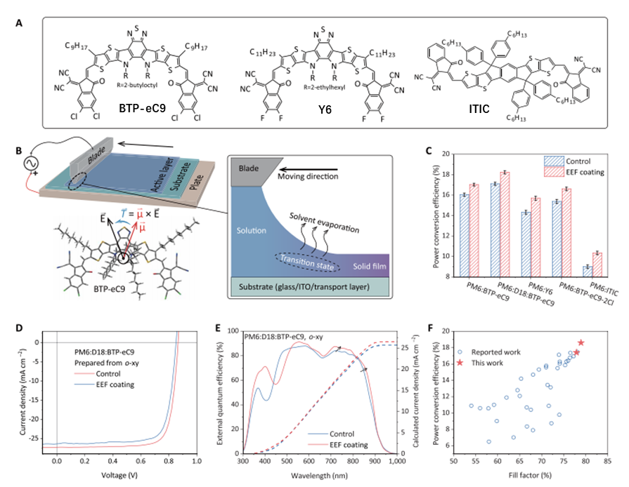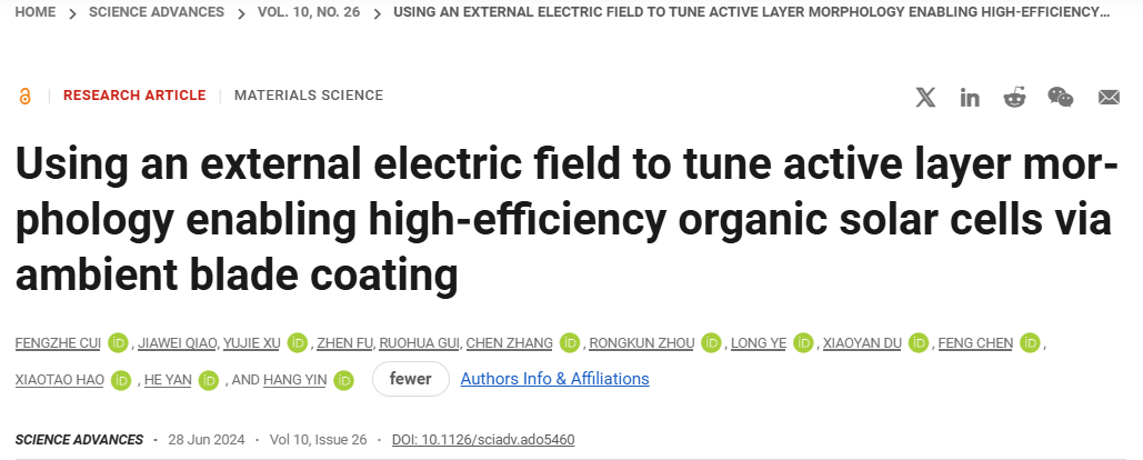 基于该背景,山东大学郝晓涛教授研究团队开发了一种外部瞬态极化场(EEF)手段,有效地在溶液涂布过程中调控了光敏活性层的微纳结构。形态学研究表明,EEF处理可以在小分子域中诱导纤维结构的形成,并提高了共混系统的载流子输运能力。通过该方法制备的器件具有更高的载流子迁移率,并实现了有机光伏器件性能的显著提高。该工作不仅提供了一种具有广泛适用性的物理方法调节活性层形貌,而且与工业化制备过程兼容,从而加速有机光伏材料和技术的工业化应用。相关工作以“Using an external electric field to tune active layer morphology enabling high-efficiency organic solar cells via ambient blade coating”为题发表在期刊《Science Advances》上。论文第一作者为山东大学物理学院博士生崔风哲,通讯作者为山东大学郝晓涛教授、殷航教授和香港科技大学颜河教授。山东大学为第一作者单位和通讯作者单位。