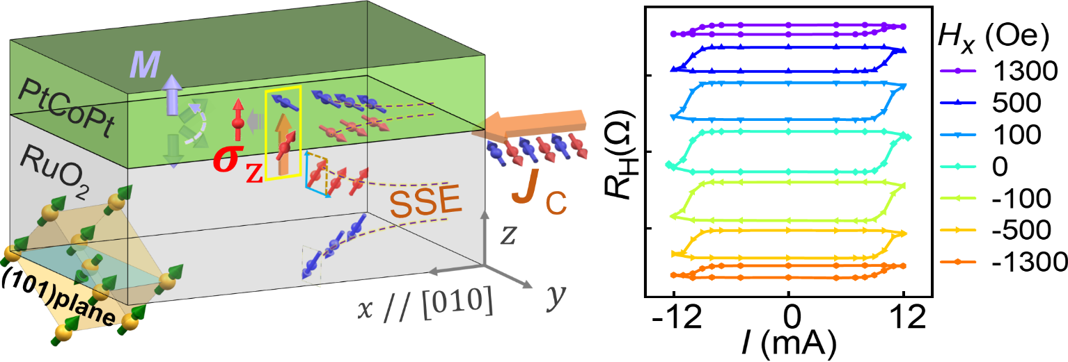 自旋电子学团队成功制备了具有垂直磁各向异性的RuO2/[Pt/Co/Pt]异质结,其中金红石相的RuO2是一种交替磁性(Altermagnetic)反铁磁材料,可以通过各向异性的能带结构产生自旋劈裂效应(Spin splitting effect)。当沿(101)取向RuO2的[010]方向施加电流时,RuO2可以产生自旋极化方向同时包含面内(σy)和面外分量(σz)的沿面外方向传播的自旋流,而[Pt/Co/Pt]仅产生自旋极化方向在面内的自旋流(σy)。通过调控[Pt/Co/Pt]层中Pt的厚度,RuO2/[Pt/Co/Pt]异质结中自旋流的极化方向便可以被调控。当面内自旋极化(σy)自旋流被完全抵消时,由纯面外自旋极化(σz)自旋流驱动的“鲁棒性”垂直磁化翻转得以实现。“鲁棒性”是指电流诱导的磁化翻转极性(顺时针或逆时针)不变,并且磁化翻转比例在较大范围的面内磁场下基本不变。该研究为实现稳定的垂直磁化翻转提供了一种有效的方法,促进了反铁磁自旋电子器件的研发。