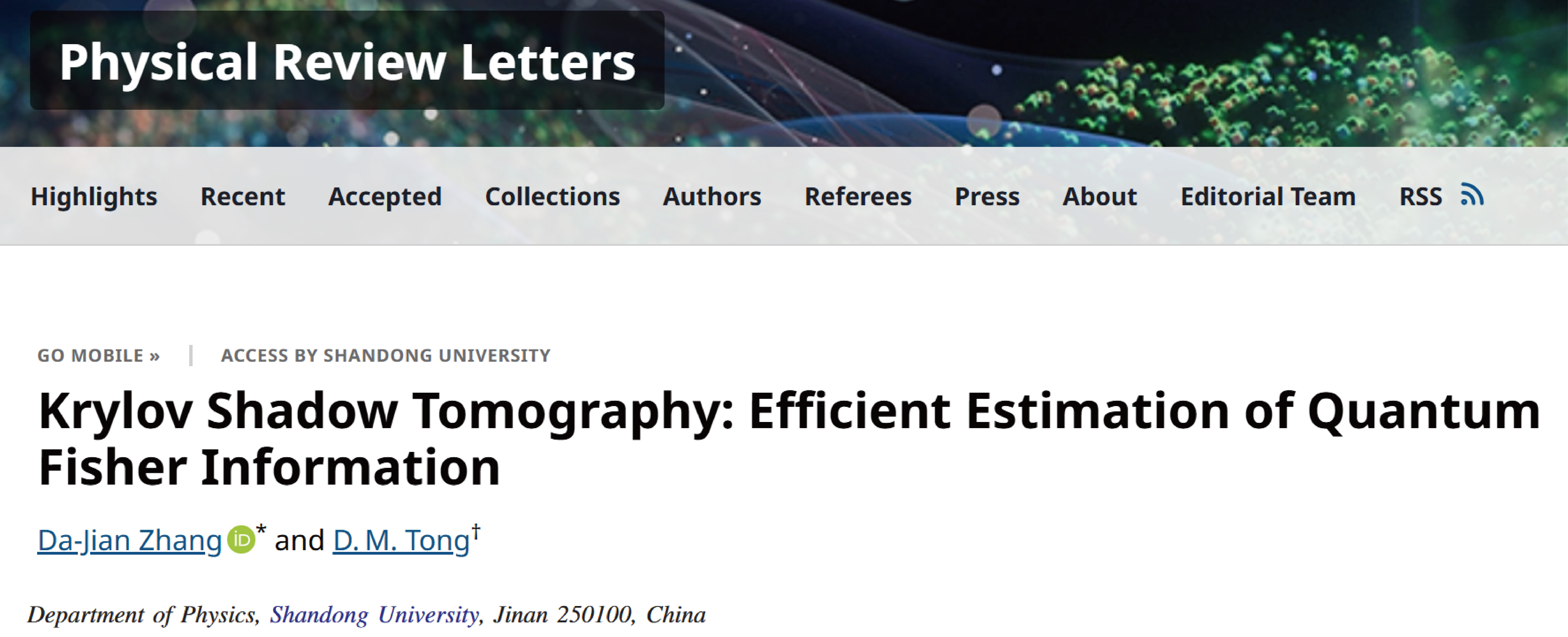 物理学院量子信息团队张大剑教授和仝殿民教授在量子测量研究领域取得重要进展,提出了基于Krylov子空间的量子测量理论,为高效估计量子Fisher信息开辟了新途径。研究成果以“Krylov shadow tomography: Efficient estimation of quantum Fisher information”为题发表在物理学顶级期刊Physical Review Letters上[PRL 134,110802,2025]。