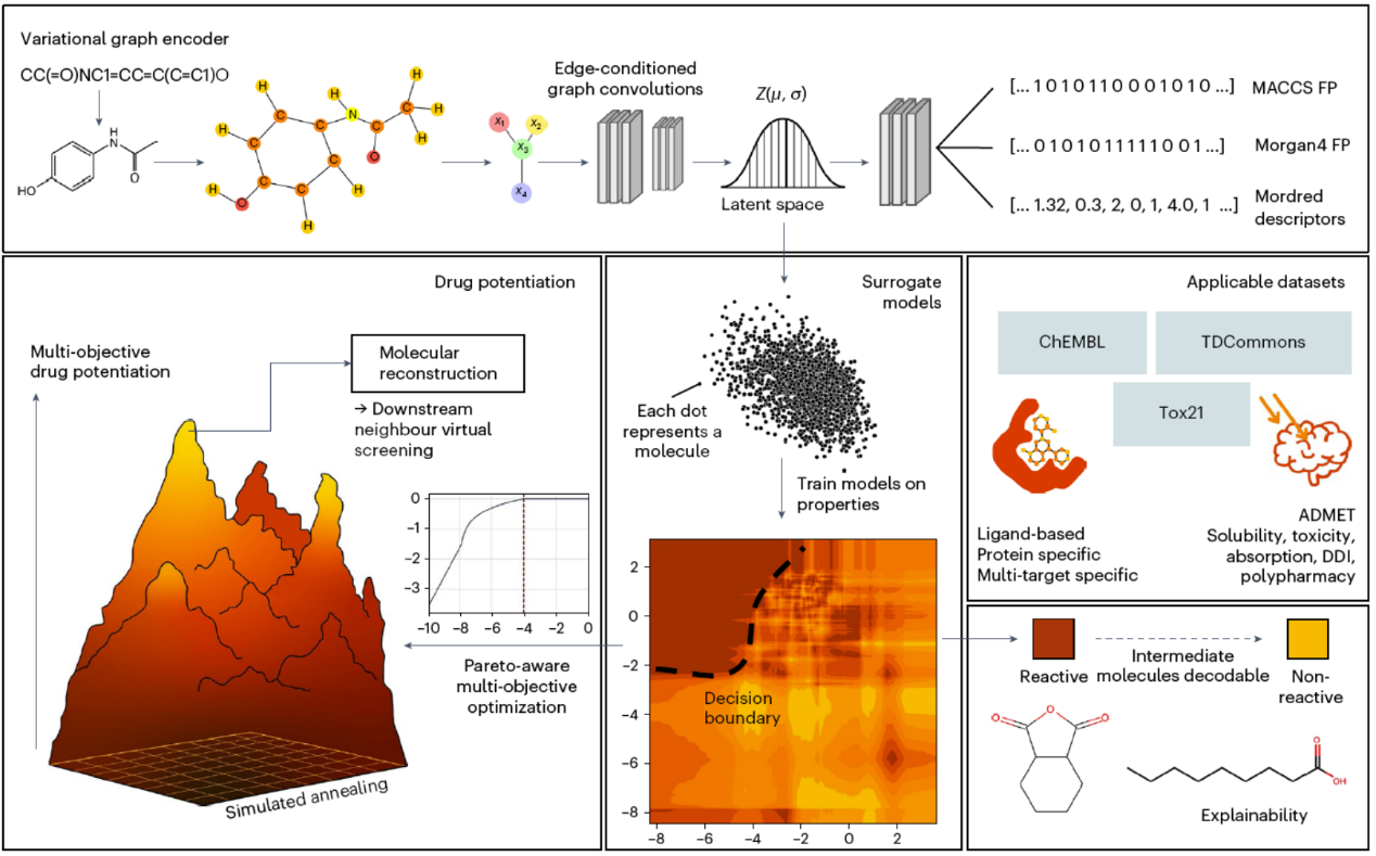 在新药研发中,药物分子的物化属性是评估其成药性的重要指标,但传统的预测方法受限于单一属性建模,难以满足多维度评价需求。李伟峰教授课题组与新加坡南洋理工大学团队合作,创新性地开发了一种基于图卷积变分自动编码器(VGEA)的机器语言模型,通过结合图卷积神经网络和变分推断算法,从分子拓扑结构中提取深层次特征,并利用自动编码器实现数据处理与传递。该模型在保持生成均匀分布潜在结构空间的同时,能够精准推测分子描述符(如Morgan4和MACCS指纹),实现了药物分子多类、多属性问题的同步预测。这一研究成果不仅突破了传统“单模型-单任务”方法的局限,还通过多任务学习机制实现了对药物多维属性的端到端预测。精度上较国际主流模型提升30%,计算效率提高两个数量级,为大规模药物筛选提供了强有力工具(图2)。