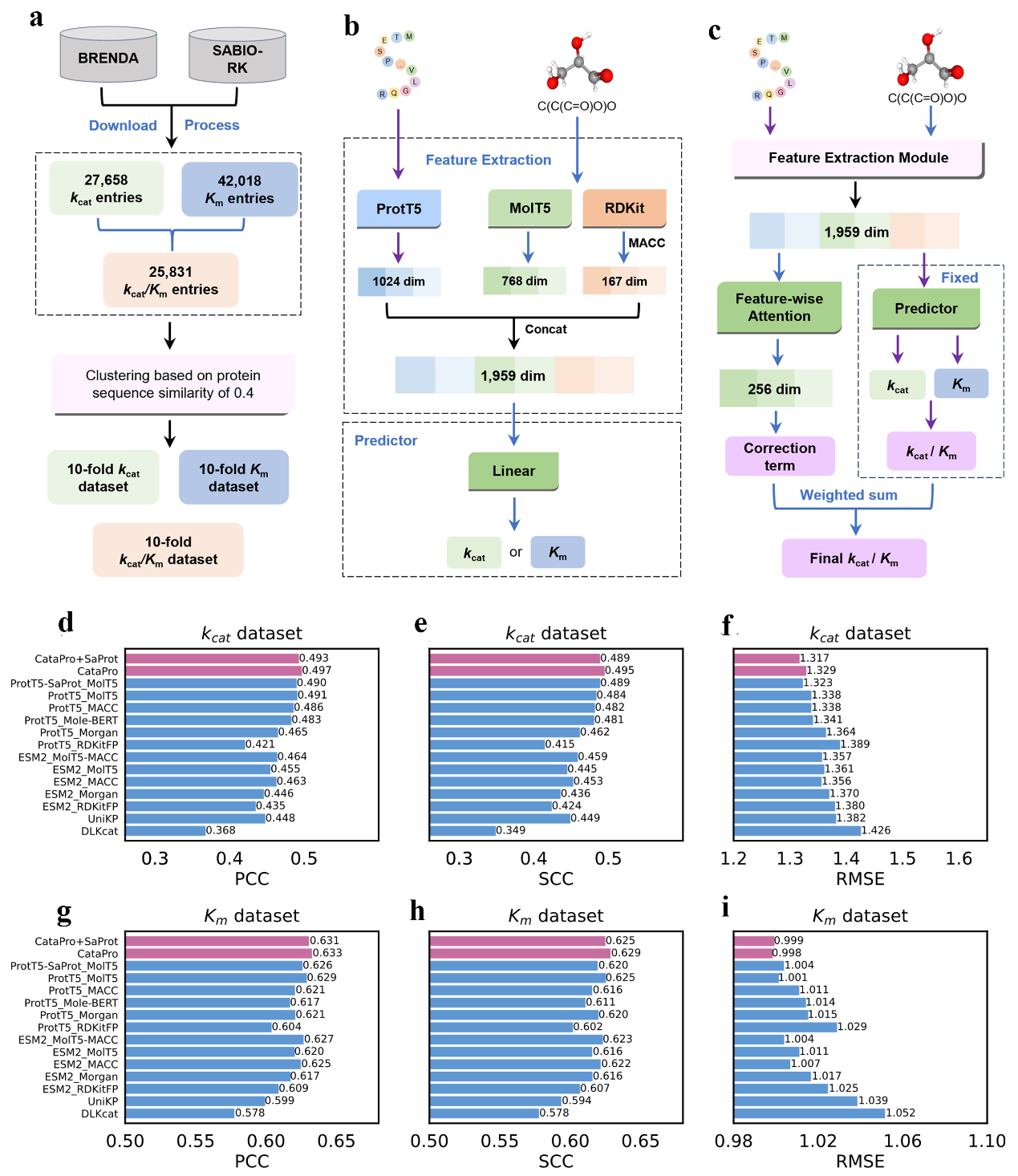 图1 a-c展示了数据集构建流程和CataPro模型框架。d-f和g-i分别展示了CataPro(红色)与其它特征表示方法及基线模型在kcat和Km无偏数据集上实现的皮尔森相关系数(PCC)、斯皮尔曼相关系数(SCC)和均方根误差(RMSE)