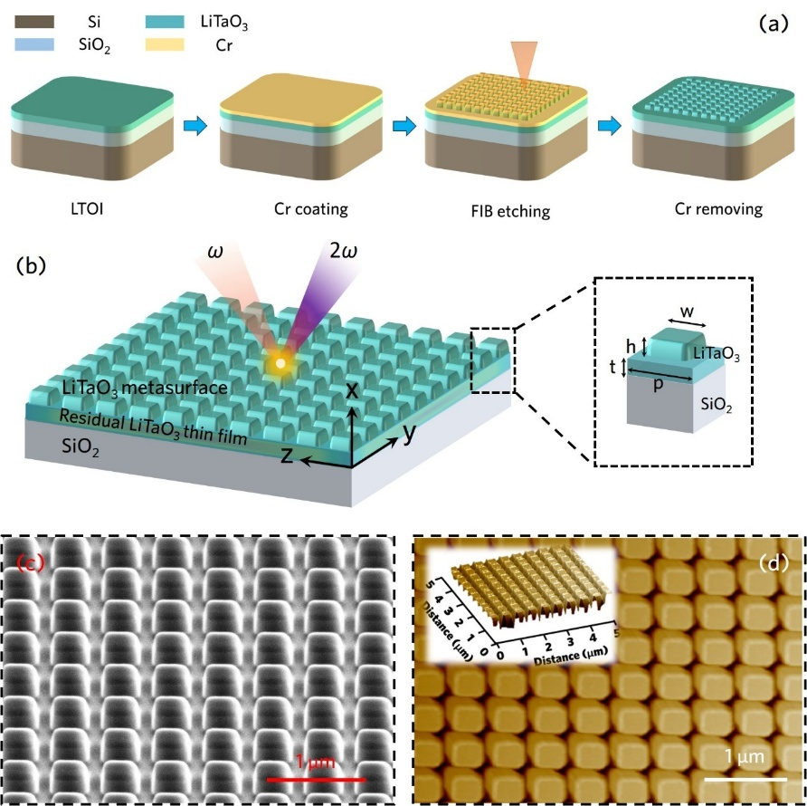 图一、钽酸锂超表面的制备流程、结构设计示意图及SEM和AFM照片。