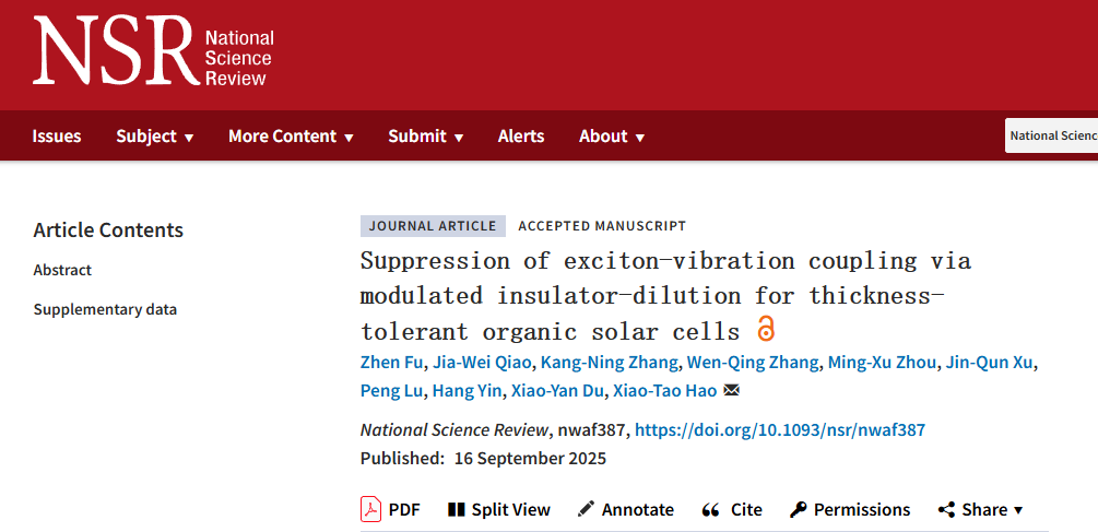 近日,我院有机光电子学团队在有机光伏激发态动力学调控研究中取得新进展,相关工作以“Suppression of exciton-vibration coupling via modulated insulator-dilution for thickness-tolerant organic solar cells”为题发表在《National Science Review》(国家科学评论,NSR,1区Top期刊,影响因子:17.1)上。论文第一作者为山东大学物理学院博士研究生付振,通讯作者为郝晓涛教授,山东大学为第一作者单位和唯一通讯作者单位。