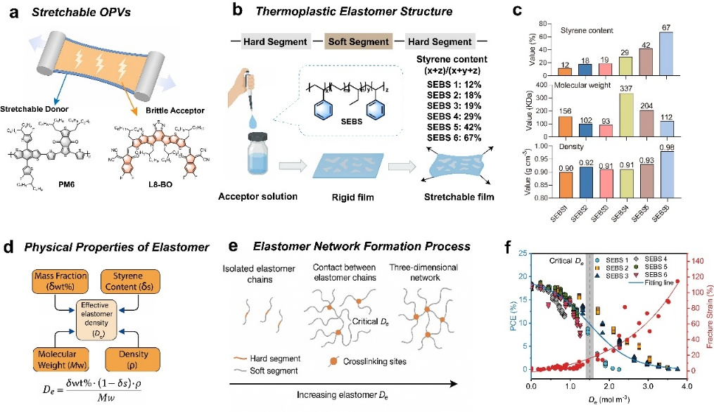 进展一:可拉伸有机光伏在柔性可穿戴电子设备方面展现出巨大应用潜力,添加低成本的热塑性弹性体被广泛用于改善有机太阳能电池的机械稳定性。热塑性弹性体具有结构多样性,其对活性层形貌、光电及力学性能的影响尚不清晰,制约可拉伸有机光伏的性能。研究团队系统研究了热塑性弹性体结构多样性对器件性能的影响,提出了“有效弹性体密度”概念,揭示了弹性体结构多样性与有机光伏激子及载流子动力学、形貌、光电和力学性能的关联机制,实现弹性体增韧器件中效率和机械性能的协同优化。相关研究成果以“Control of Effective Elastomer Density Enables Mechanically Robust and High‐Efficiency Intrinsically Stretchable Organic Solar Cells”为题发表于《Advanced Materials》,山东大学博士研究生孙铭为论文第一作者,通讯作者为山东大学郝晓涛教授、杜晓艳教授以及天津大学叶龙教授,山东大学为第一作者单位和通讯作者单位。
