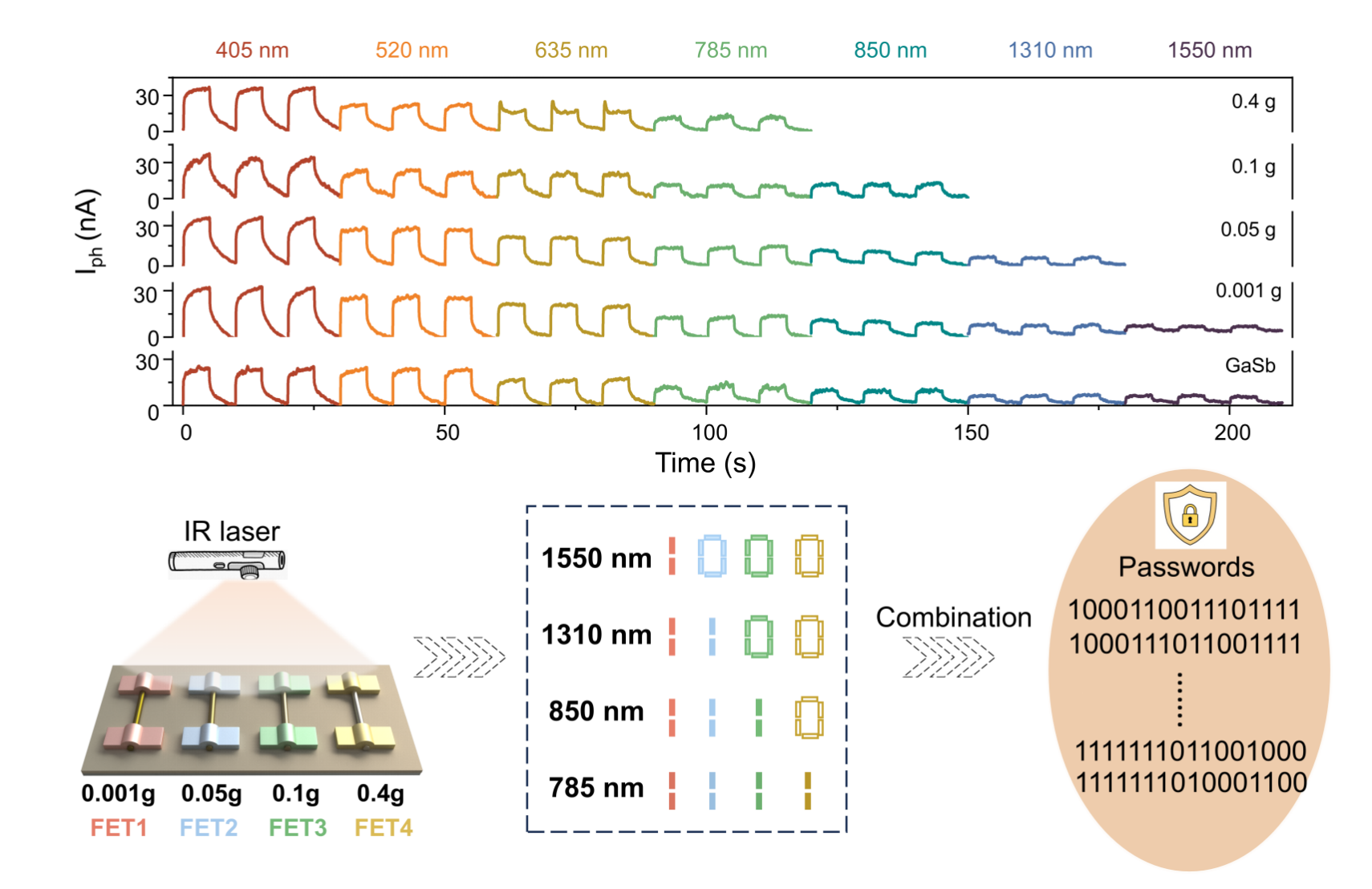近期,学院杨再兴课题组通过能带工程调控了锑化镓纳米线的带隙,通过调制光谱范围,采用四种不同带隙的锑化镓纳米线实现了红外光谱加密。最后将红外光谱加密作为门上的密码锁进行了演示,涵盖了高级加密需求。相关研究结果以“Tunable photodetection range of GaSb nanowires for infrared spectral encryption”为题发表于Nano Letters期刊上。学院为论文第一通讯单位,硕士生王晓玥为论文第一作者。