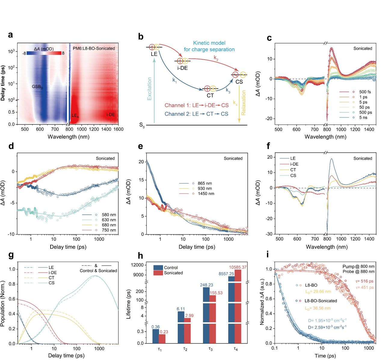 该有序聚集结构在成膜过程中得以有效保持,从而增强了π-π堆叠相互作用。研究表明,超声处理还能促进局域激子向分子内离域激子的转化,提升了激子解离效率,并有效抑制了分子振动。基于此方法制备的有机光伏器件性能得到了显著提高。这一具有广泛适用性的超声物理场方法不仅可以有效调控非富勒烯受体的聚集,还可以与大面积制备技术相兼容,促进有机光伏材料与器件的工业化应用。相关工作以“Sonication-induced J-aggregation in nonhalogenated solvents boosts exciton delocalization for high-efficiency organic solar cells”为题发表于期刊《Nature Communications》。山东大学博士研究生周明旭为论文第一作者,通讯作者为山东大学郝晓涛教授、张康宁博士以及北京航空航天大学孙艳明教授。山东大学为第一作者单位和通讯作者单位。