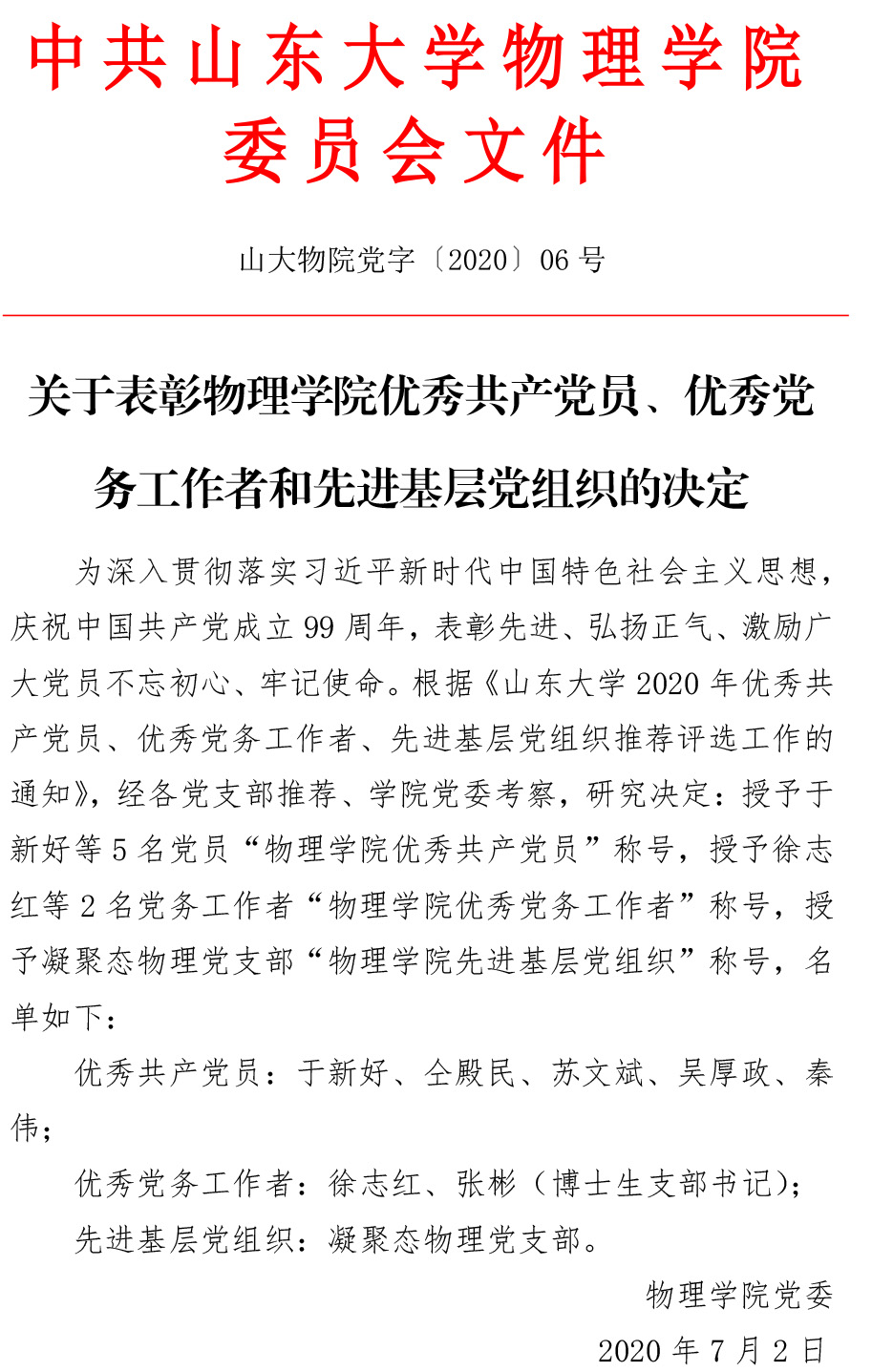 关于表彰物理学院优秀共产党员、优秀党务工作者和先进基层党组织的决定