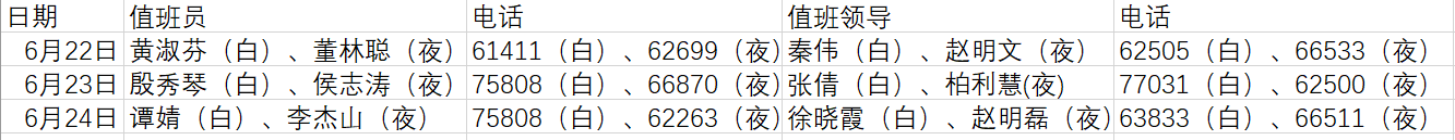 严格落实值班值守工作要求。学院安排处级干部和工作人员各一人24小时在岗值班。放假期间严格落实每日情况“零报告”,如遇有突发情况及时响应、妥善处置,遇重大敏感事项、紧急事项第一时间报告,不得漏报、迟报、瞒报。值班情况如下: