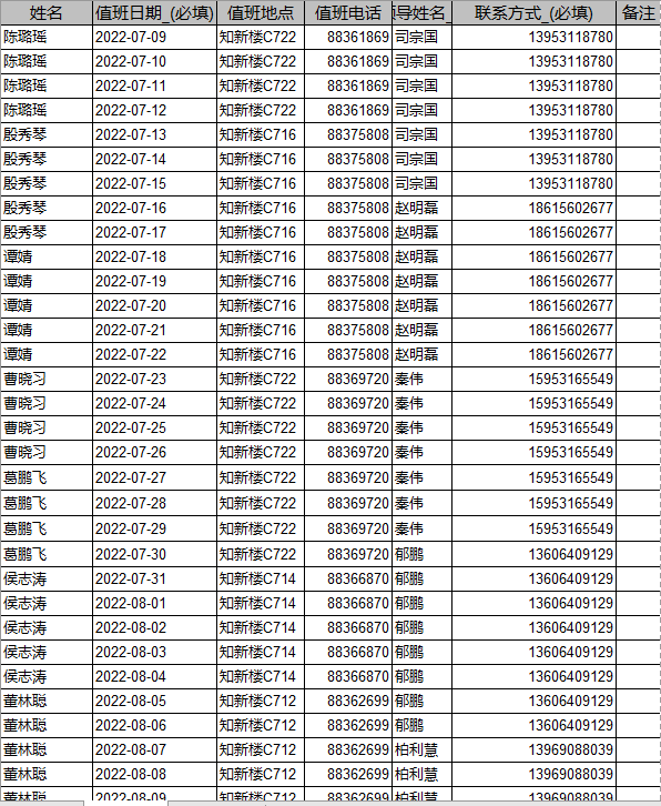 学院每天安排1名处级领导和1名工作人员白天(8:00-18:00)在岗值班,夜间(18:00-次日8:00)在校区驻地负责听班。附值班表如下: