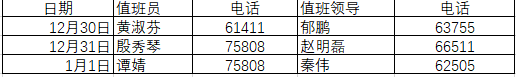 学院要统筹做好年度总结、期末考试组织、走访慰问等年末各项工作。假期前要加强安全教育,师生离开学校驻地要严格执行请销假制度。要认真组织开展安全检查,全面排查风险隐患,加强对低温雨雪冰冻等极端灾害天气的预警,完善细化应急预案,做好应急处置准备。积极做好新冠、流感等呼吸道传染病防控工作,科学宣传防治知识,倡导做好个人防护。严格落实值班值守工作要求,确保联络畅通,突发事件报告、紧急事务处理及时到位。值班表如下: