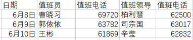 假期期间严格落实《关于加强近期值班值守工作的通知》要求,学院安排处级干部和工作人员各1人白天在岗值班,夜间听班。值班表如下: