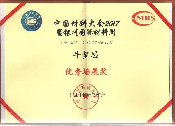 2017年7月8-12日,由中国材料研究学会年度学术会议“中国材料大会2017”在宁夏银川市举办。我院郝晓涛课题组一行四人参加会议,牛梦思同学获得最佳墙展奖(获奖比例为百分之二)。通过参加本次会议向全国同行展示了团队的最新研究成果,提高了山东大学物理学科有机电子学方向的学术影响力。