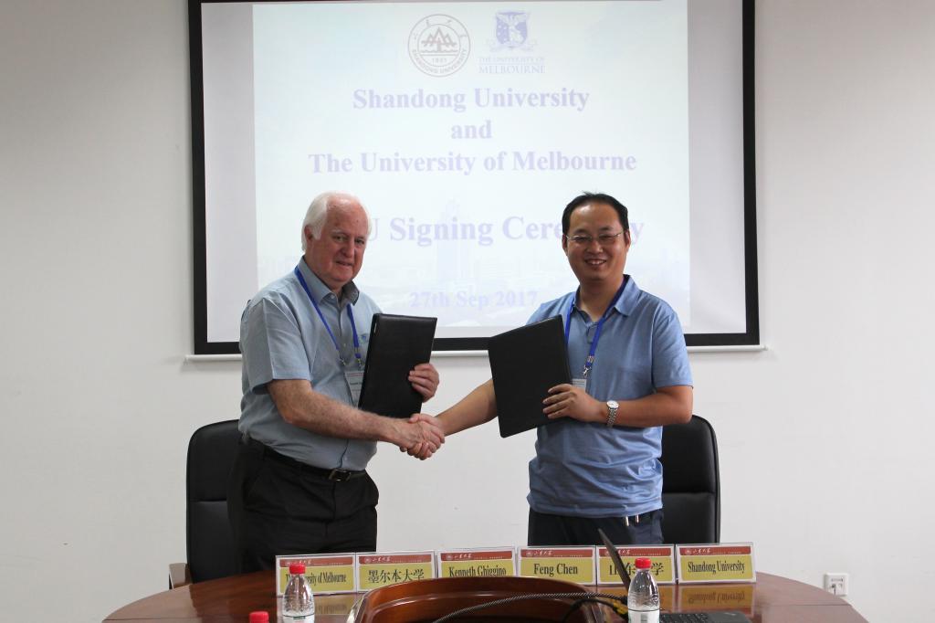 在“薄膜暨光子学与有机电子学交叉学科国际学术研讨会”期间,还举办了山东大学-墨尔本大学两校合作协议的交换仪式。去年9月墨尔本大学来访期间,提出希望与我校签署校际合作框架协议。经过磋商,双方最终于今年9月正式签署协议。协议交换仪式由郝晓涛教授主持。他介绍了过去几年双方已奠定的坚实的合作基础,在合作研究、共同申请科研项目、学者互访、学生联合培养、联合发表论文、共同举办研讨会等方面已经取得了丰硕成果,协议的签署,将继续推进双方广泛而深入的合作。Kenneth Ghiggino教授随即代表墨尔本大学发言,他对双方前期的合作做出了肯定,协议的签署,必将继续推动和拓宽双方的交流与合作。物理学院院长陈峰、党委副书记张倩、办公室主任于新好出席仪式。